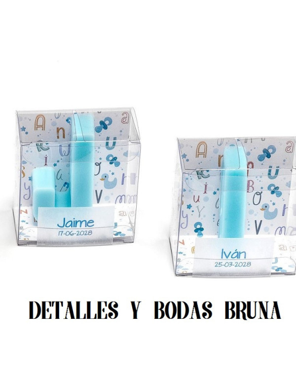 Jabones para bautizo con inicial del nombre de tu peque presentado en cajita transparente personalizada con nombre y fecha. Detalle útil y original con el que sorprender.