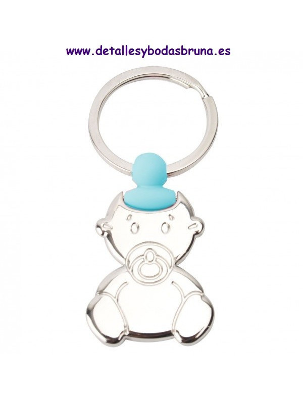 Prácticos llaveros de metal con forma de bebe en tonos celeste. Perfectos como detalle para bautizos y otros eventos