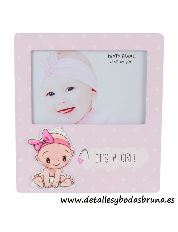 ORIGINAL PORTAFOTOS DE MADERA O MARCO PARA FOTOS COMO DETALLE PARA EL BAUTIZO DE TU PEQUE. REGALO ORIGINAL CON UN BONITO DISEÑO EN COLOR rosa CON TOPOS BLANCOS Y BEBÉ EN RELIEVE.