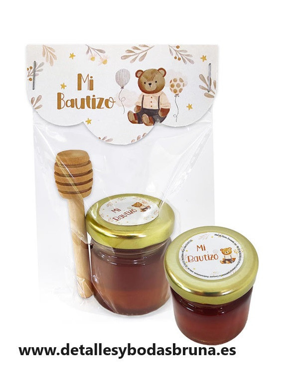 TARRO O BOTE DE MIEL PARA LOS INVITADOS A L BAUTIZO DE TU PEQUE, CON PALITO O CUCHARA DE MADERA EN PACK CON PRESENTACIÓN. DETALLE ORIGINAL PARA LOS INVITADOS A TU FIESTA O CELEBRACIÓN. TE LAS PODEMOS ENVIAR CON ETIQUETAS ADHESIVAS PERSONALIZADAS.