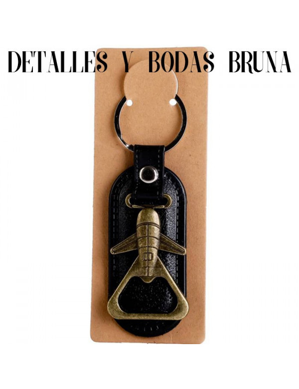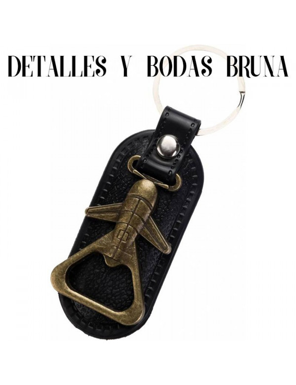 ORIGINAL LLAVERO ABREBOTELLAS CON FORMA DE AVIÓN COLOR COBRE Y BASE DE POLIPIEL NEGRA, SE ENVÍA PRESENTADO EN CARTÓN KRAFT DE REGALO.