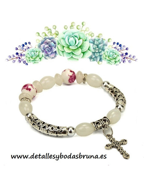ORIGINALES PULSERAS EN TONO PLATA DE ESTILO PANDORA CON BOLAS CON FLORES y decorada con un colgante con forma de cruz. DETALLE BONITO Y ORIGINAL PARA LAS INVITADAS A TU BODA, comunion, FIESTA O CELEBRACION.
