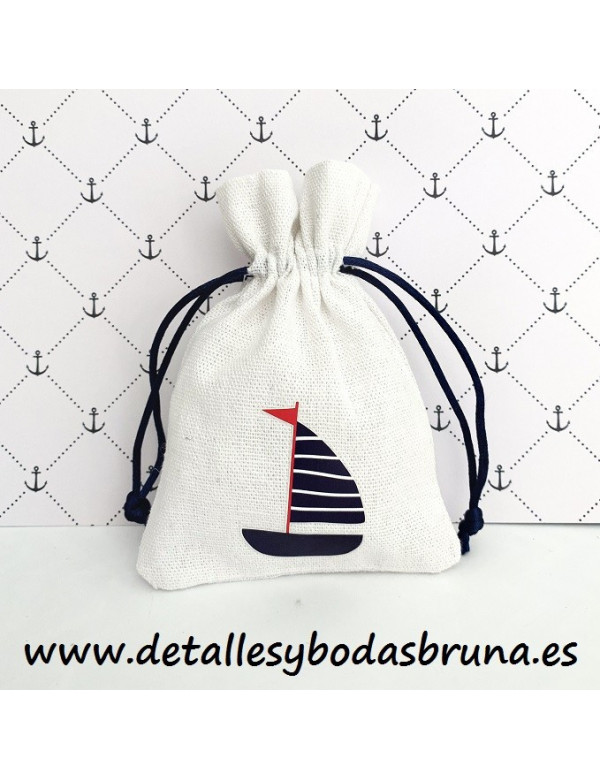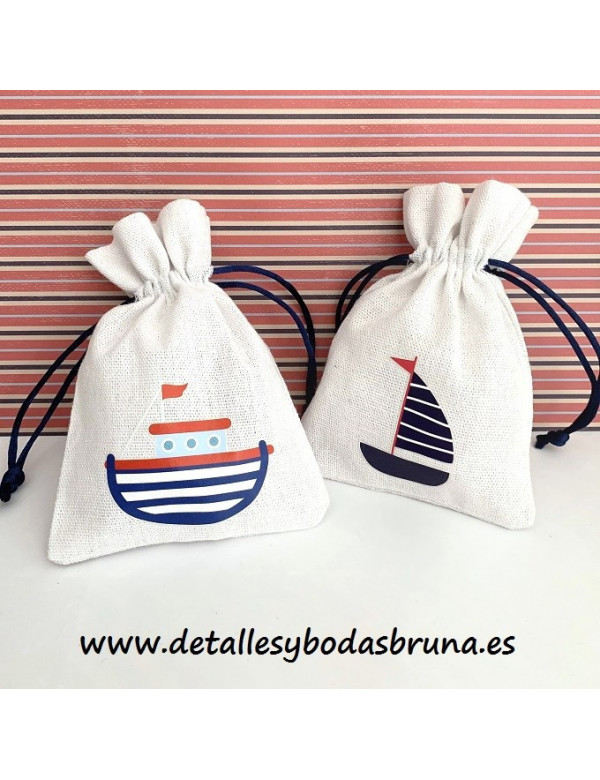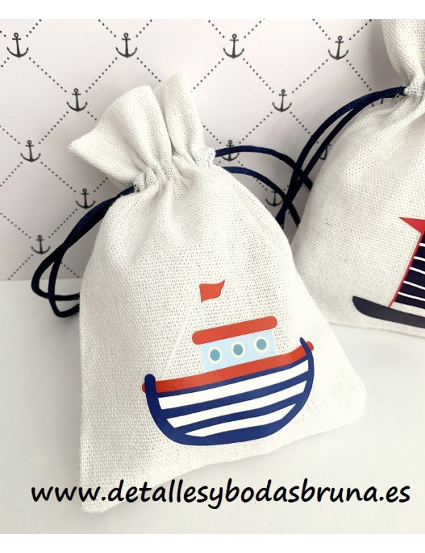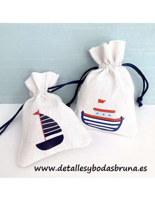 bolsitas de tela o lino con motivos marineros ideales para presentar los detalles, dulces y bombones para los invitados a tu boda, COMUNIÓN, bautizo, fiesta o evento.