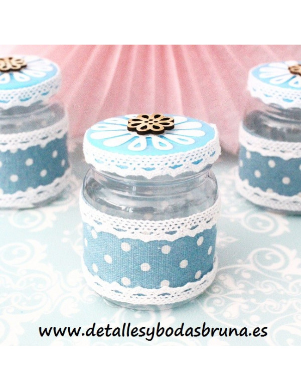 PEQUEÑOS TARROS O RECIPIENTES DE PLÁSTICO TRANSPARENTE CON TAPA DE ALUMINIO DE COLOR PLATEADA DECORADOS CON TELA EN TONOS celeste CON LUNARES Y LAZO CON FLOR DE MADERA EN SU PARTE SUPERIOR. PERFECTAS PARA PRESENTAR PEQUEÑOS DETALLES COMO PULSERAS, CHUCHES, CARAMELOS, BOMBONES...