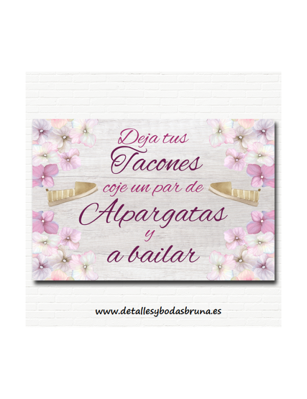 CARTEL EN TABLA LIGERA DE ESTILO ROMÁNTICO, CON FONDO SIMULANDO MADERA Y HORTENSIAS EN TONOS ROSA Y LILA. EN EL QUE SE PUDE LEER "deja tus tacones, coge un par de alpargatas y a bailar" PERFECTO PARA UTILIZAR EN LA MESA, CAJA O CESTA DE LAS ALPARGATAS DE TU BODA, FIESTA, COMUNIÓN O CELEBRACIÓN.