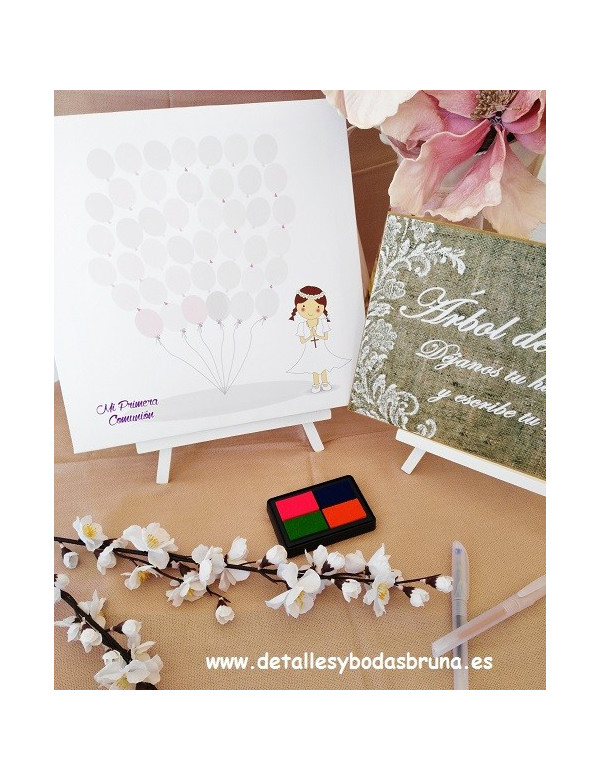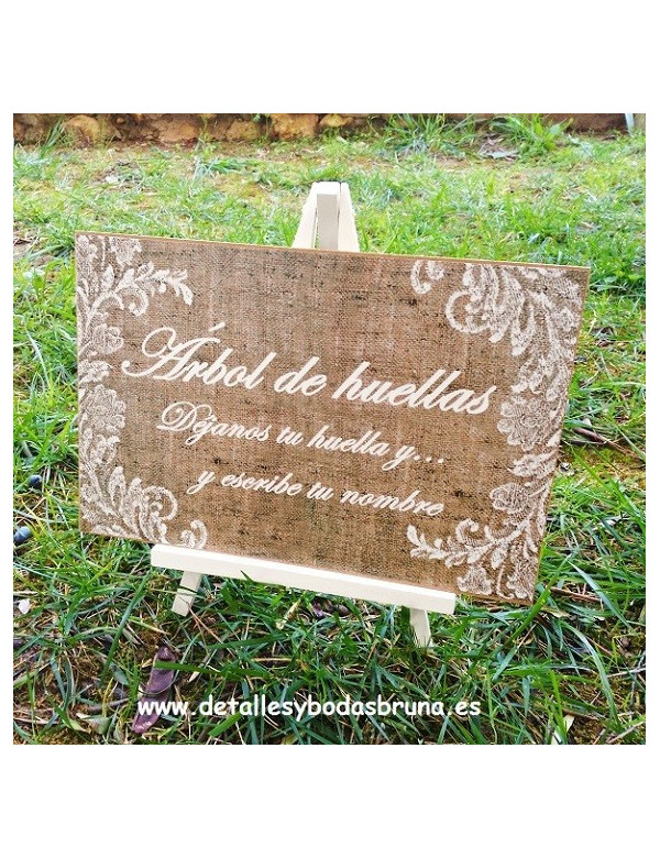 Cartel en tabla ligera de estilo vintage, con fondo simulando yute adornado con blonda y letras blancas, en el que se pude leer "Arbol de Huellas ", perfecto para utilizar en la mesa de los protectores de tacon en tu boda o evento.