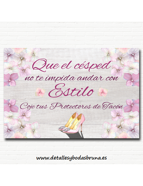 CARTEL EN TABLA LIGERA DE ESTILO romantico, CON FONDO SIMULANDO madera Y hortensias en tonos rosa y lila. EN EL QUE SE PUDE LEER "que el CÉSPED no te impida andar con estilo, coge tus PROTECTORES de TACÓN", PERFECTO PARA UTILIZAR EN LA MESA DE LAS BAILARINAS, ALPARGATAS Y PROTECTORES DE TACÓN DE TU BODA, FIESTA, COMUNIÓN O CELEBRACIÓN.
