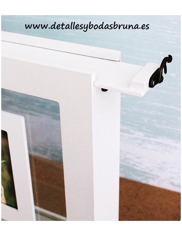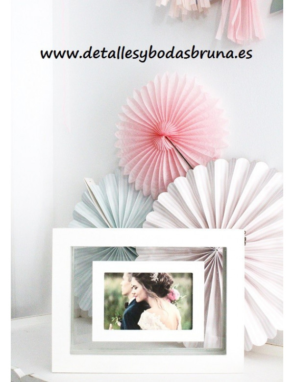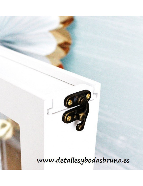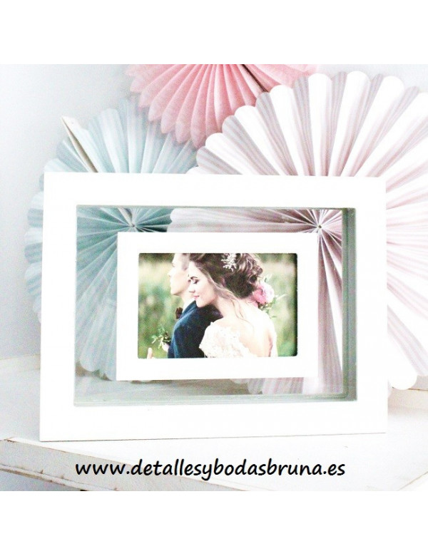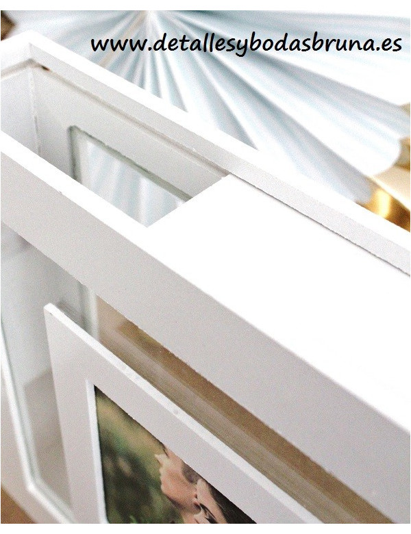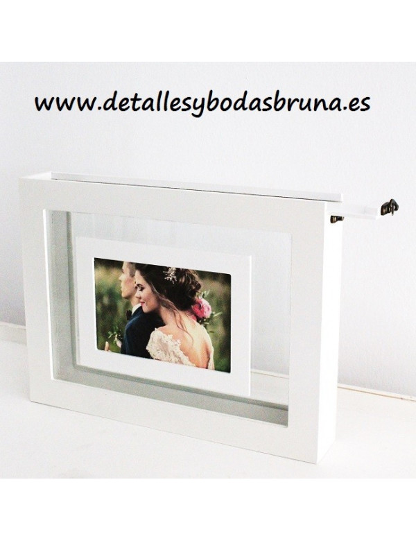 marco de madera y cristal, para la CEREMONIA DE LA ARENA o ritual de la arena en color blanco con tapa deslizante y cierre. tiene marco para fotos de los novios, familia...