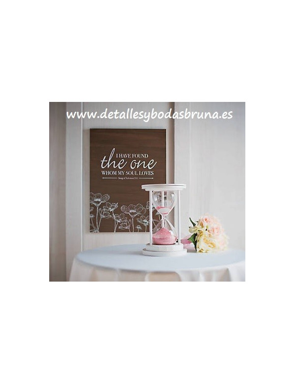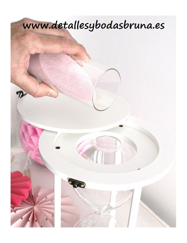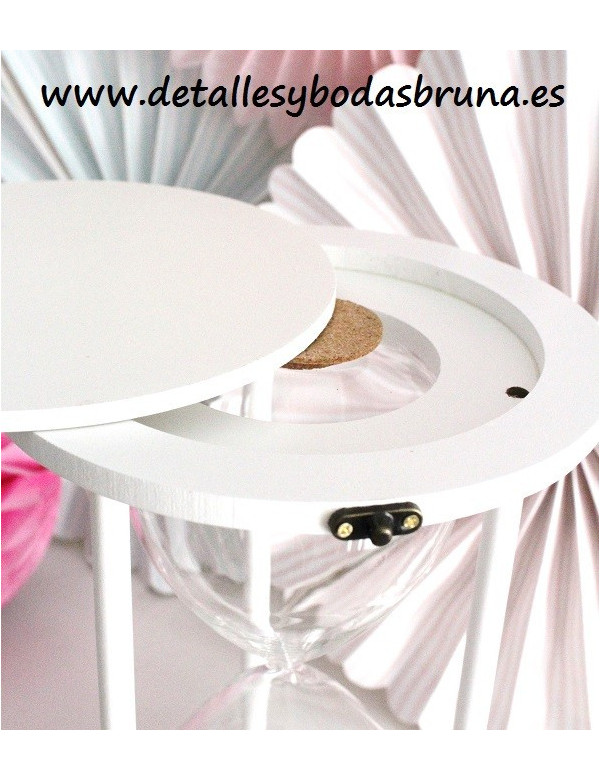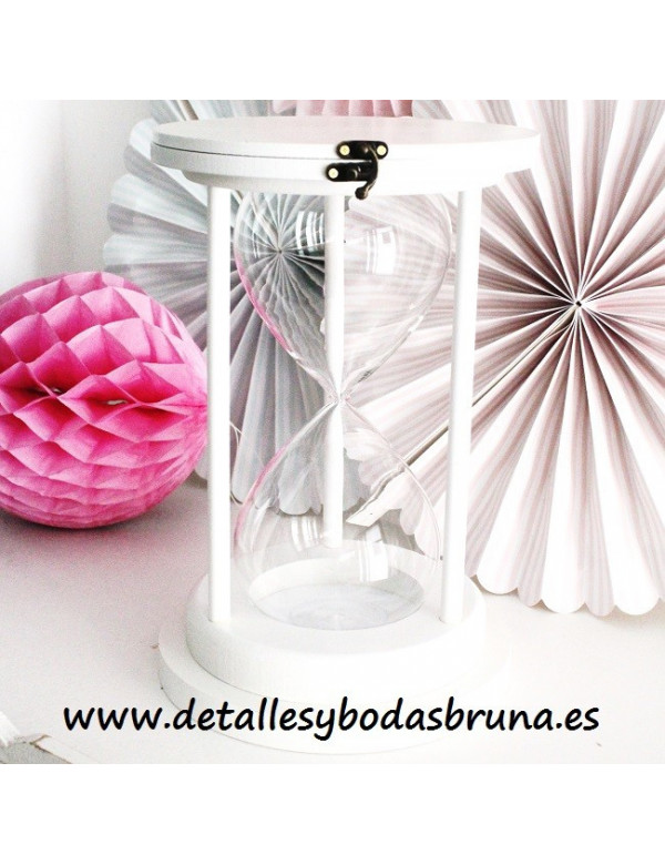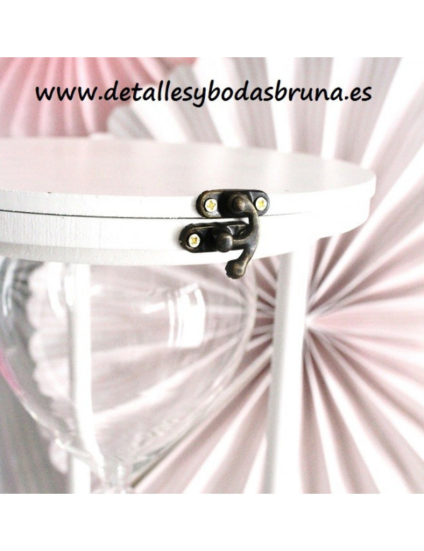 reloj de arena DE MADERA Y CRISTAL, PARA LA CEREMONIA DE LA ARENA O RITUAL DE LA ARENA EN COLOR BLANCO CON TAPA DESLIZANTE Y CIERRE.