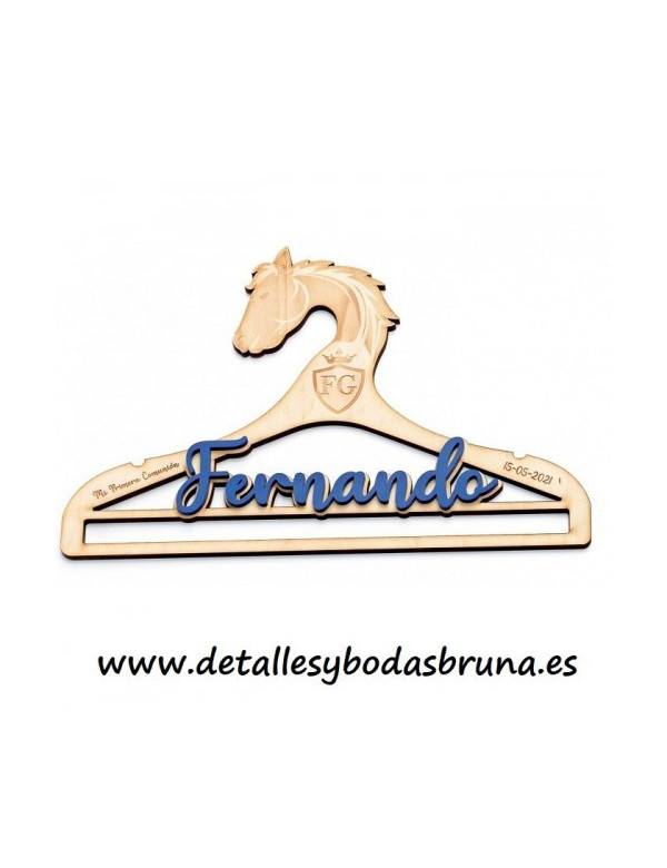 PRECIOSA PERCHA DE MADERA CON FORMA DE CABALLO PERSONALIZADA CON EL NOMBRE DEL NIÑO O NIÑA EN METRACRILATO EN COLOR AZUL Y SU FECHA DE CELEBRACIÓN GRABADA EN UN LATERAL Y EL TEXTO "MI PRIMERA COMUNIÓN" EN OTRO LATERAL.