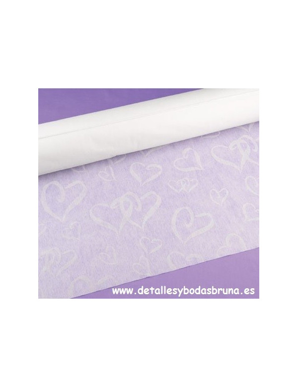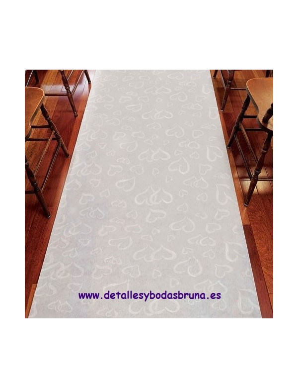 Pasillo o Camino para bodas elaborado en tela ligera tipo poliester de color blanco y decorado con corazones entrelazados.