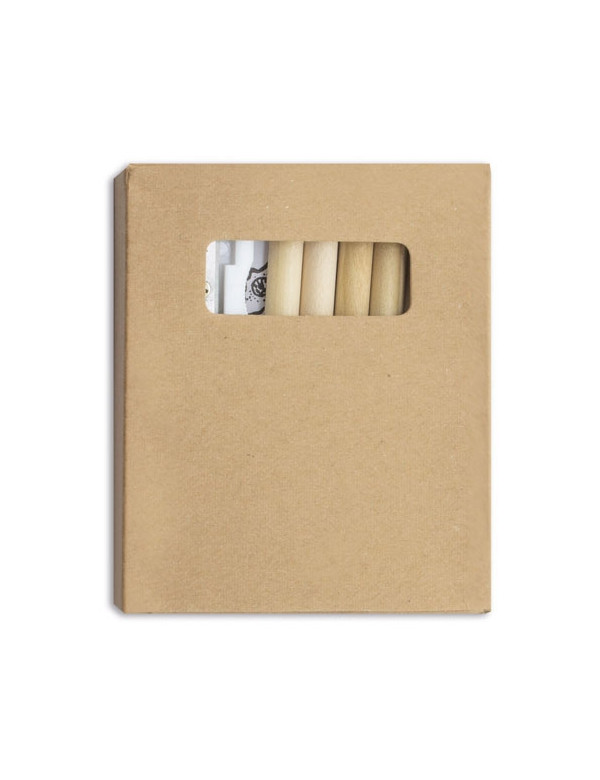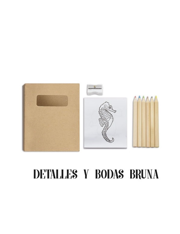 Cajita de cartón kraft con libreta con dibujos para colorear, con sacapuntas, con seis colores en colores surtidos, ideal para mantener a los más peques entretenidos, entrégalos junto a nuestras libretas personalizadas, detalle original que gustará a peques y mayores.
