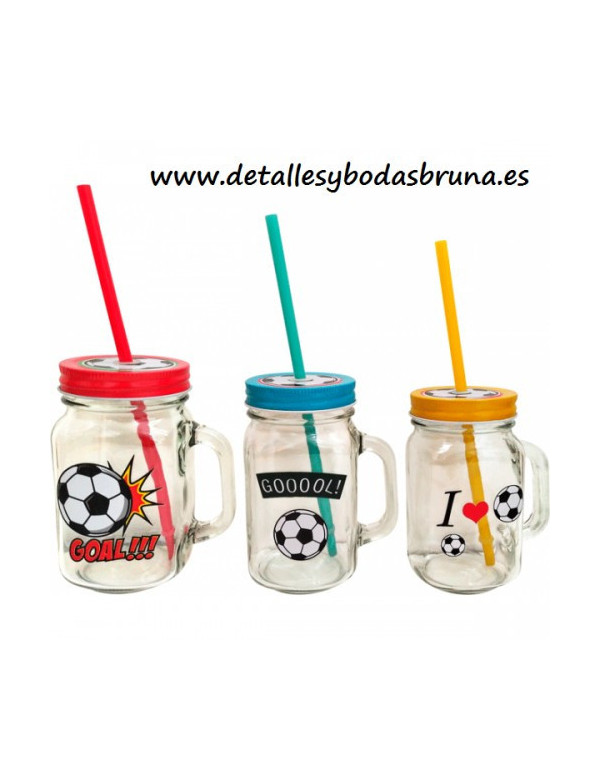 jarras de cristal decoradas con TEMÁTICA FÚTBOL, incluyen caña o pajita de color a juego con la jarra. incluyen tapa METÁLICA decorada con una pelota de FÚTBOL. REGALO PRáCTICO Y ORIGINAL PARA NIÑOS Y NIÑAS DE TU BODA, CUMPLEAÑOS, PRIMERA COMUNIÓN, FIESTA, ANIVERSARIO...