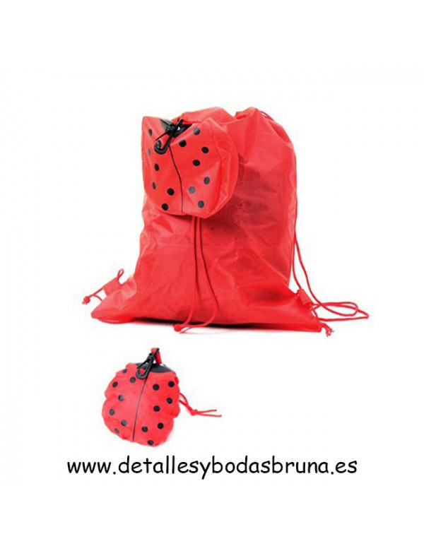 MOCHILA mariquita EN COLOR rojo, COMO DETALLE O REGALO ÚTIL Y ORIGINAL PARA LOS NIÑOS INVITADOS A TU BODA, A LA COMUNIÓN O CUMPLEAÑOS DE TU PEQUE. SE CONVIERTE EN UNA DIVERTIDA mariquita AL PLEGAR LA BOLSA. TIENE UN ENGANCHE TIPO MOSQUETÓN.