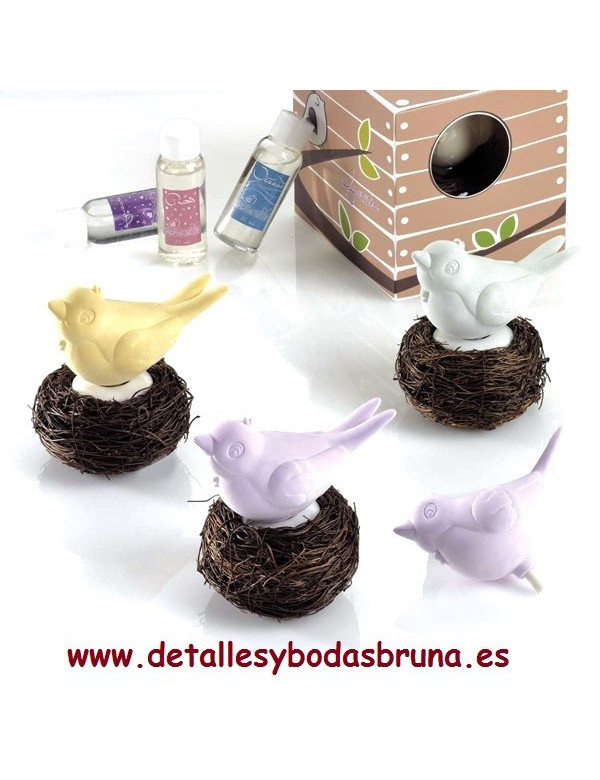 Original difusor de aromas con forma de pájaro hecho en cerámica, posado en su nido.