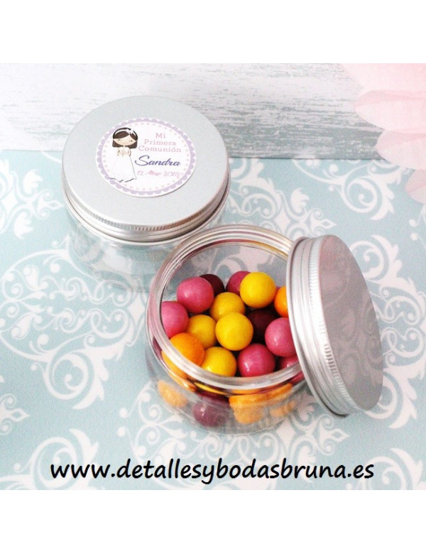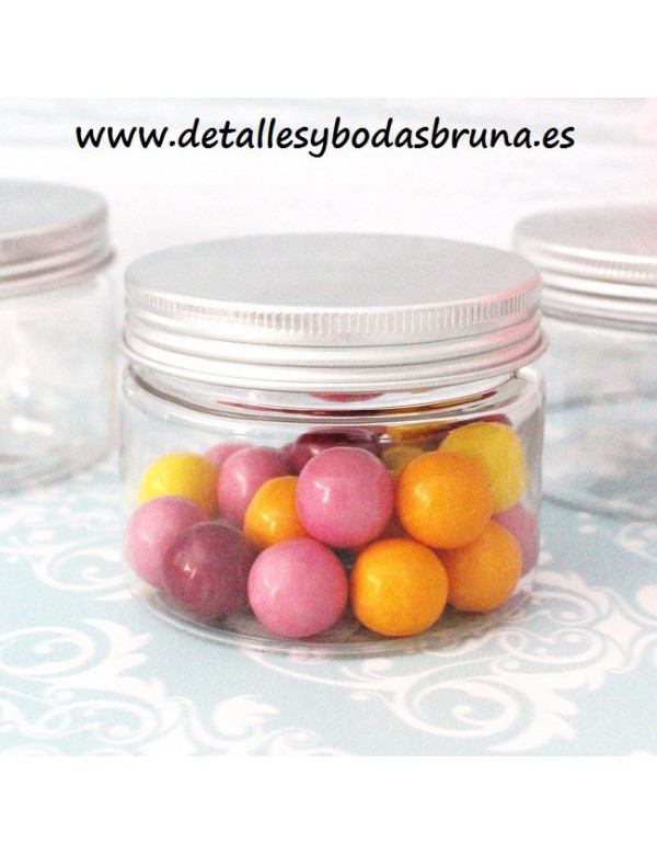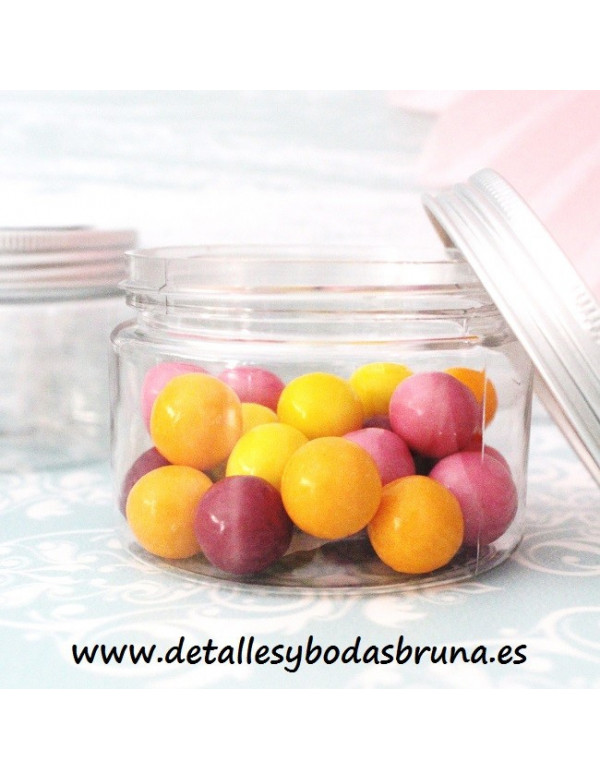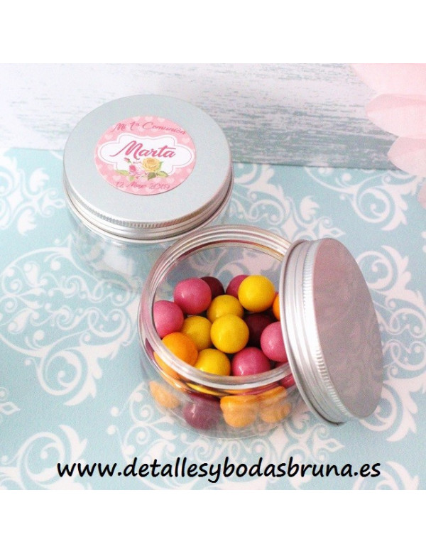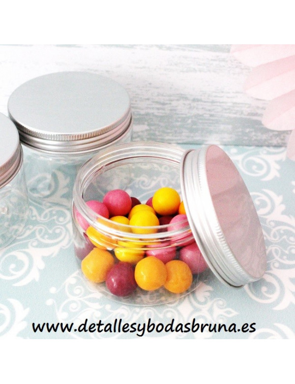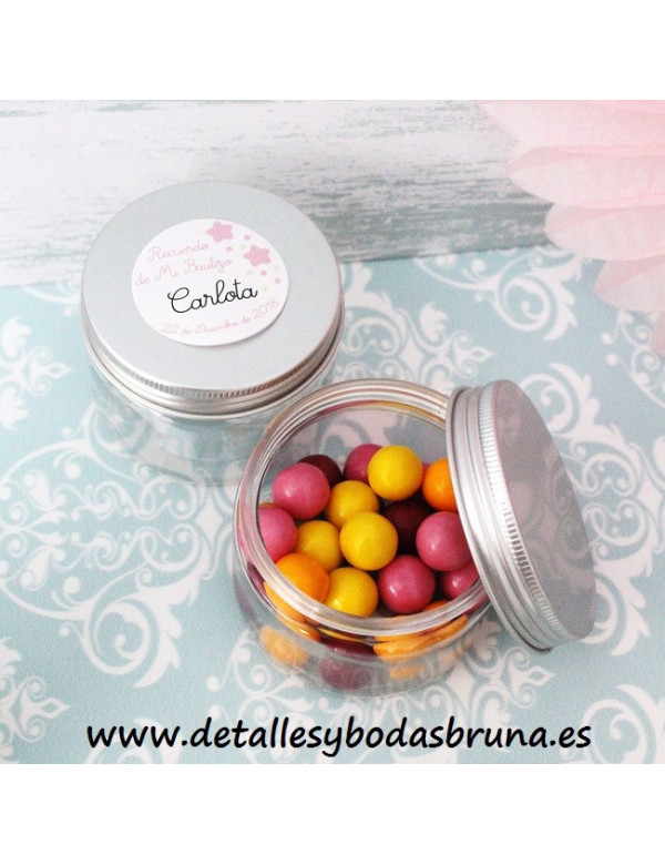 PEQUEÑAS LATITAS REDONDAS DE PLÁSTICO TRANSPARENTE con tapa de ALUMINIO DE COLOR plateada. PERFECTAS PARA PRESENTAR PEQUEÑOS DETALLES COMO PULSERAS, CHUCHES, CARAMELOS, BOMBONES... PERSONALÍZALAS CON NUESTRAS ETIQUETAS ADHESIVAS