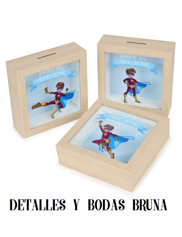 Hucha de madera héroe niña, original para comuniones, bodas, cumpleaños, bautizos y otros eventos.