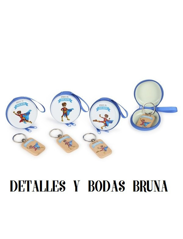 Monedero héroe de niño y llavero de madera. Regalo original para comuniones, bodas, bautizos, cumpleaños y otros eventos.