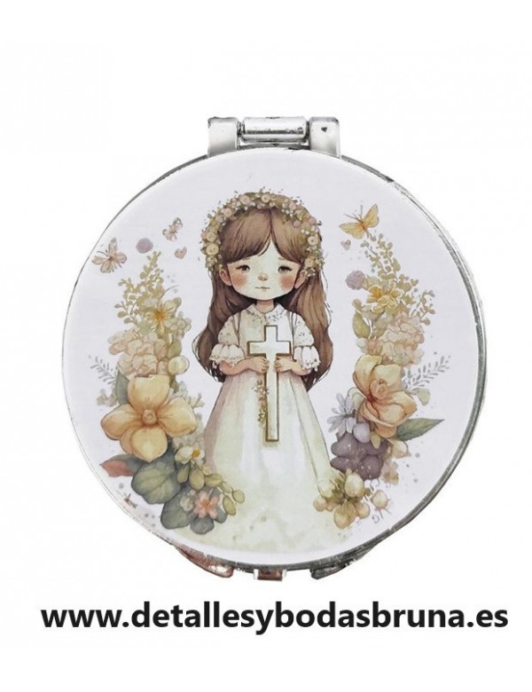 Espejo para comunión con dibujo de niña con cruz. Regalo que podemos enviarte personalizado para entregar a las mujeres, adolescentes y niña de tu celebración.