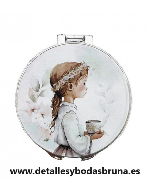 Espejo para comunión con dibujo de niña con corona de flores. Podemos enviártelos personalizados con nuestras bolsas o cajitas con tarjetas personalizadas o etiquetas adhesivas personalizadas.