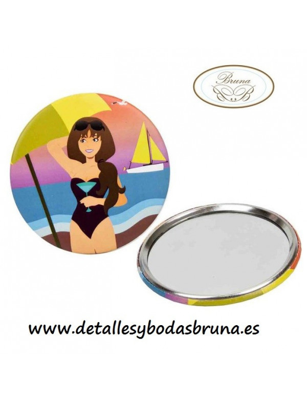 ORIGINALES Y DIVERTIDOS ESPEJOS CON MOTIVOS DE CHICAS EN bañador con playa y barco o velero de fondo. ELABORADO EN METAL DE CHAPA. PERFECTO PARA REGALAR A LAS INVITADAS DE TU BODA, COMUNIÓN, BAUTIZO, CUMPLEAÑOS O CUALQUIER EVENTO.