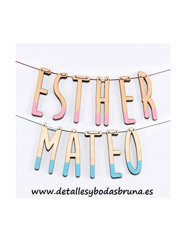 ORIGINAL GUIRNALDA PERSONALIZADA DE MADERA CON EL NOMBRE DEL NIÑO O NIÑA DE LA COMUNIÓN O BAUTIZO, O PARA PONER LA PALABRA QUE QUIERAS. SE PUEDE ELEGIR COLOR EN ROSA O AZUL.