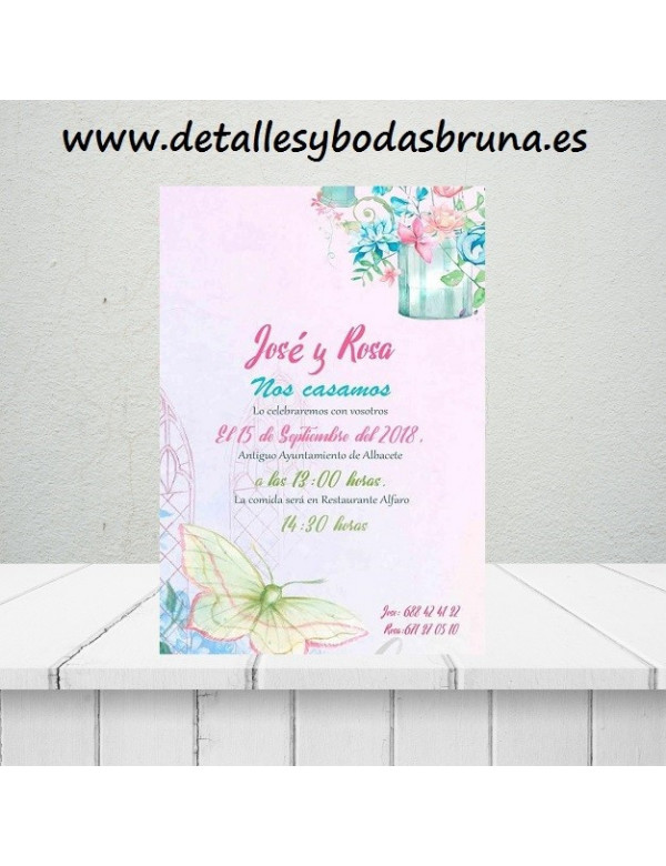 INVITACIÓN DE BODA ORIGINAL CON DISEÑOS DE mariposas y flores tipo violetas en tonos azules, verdes y lila. PERFECTA PARA BODAS ROMÁNTICAS.