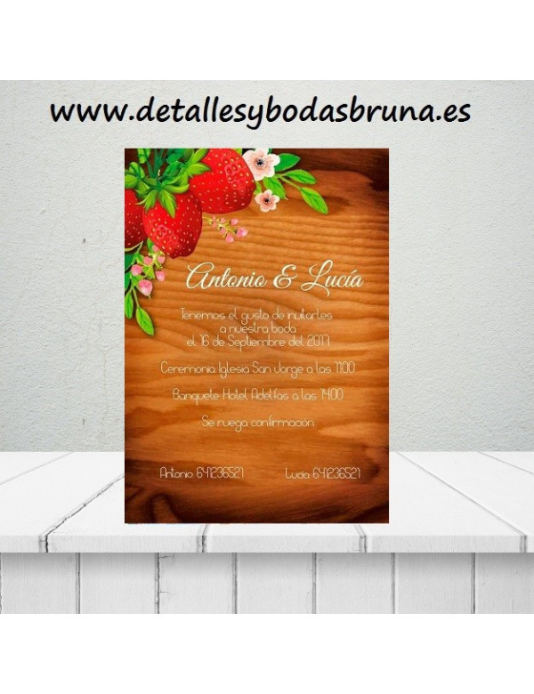 INVITACIÓN DE BODA ORIGINAL Y diferente PARA ENTREGAR A LOS INVITADOS A TU CELEBRACIÓN. INVITACIÓN DE BODA con fresas y fondo en madera. PERFECTA PARA BODAS BONITAS !