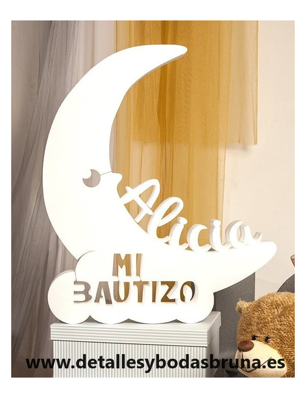 Figura de corcho blanco con forma de luna personalizada con el nombre de tu niño o niña. Decoración ideal para la celebración del bautizo de tu bebé.