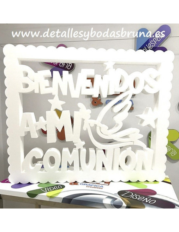 ORIGINAL cartel en corcho blanco o porexpan decorado con filigranas alrededor y estrellas. perfecto para decorar la COMUNIÓN de tu niño o niña. IDEALES PARA DECORAR EL CANDY BAR O MESA DULCE DE TU FIESTA.
