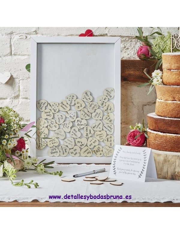 Original "Libro de Firmas" en forma de Marco en el que se introducen Corazones de Madera en los que tus invitados podrán escribir sus mensajes, nombres...