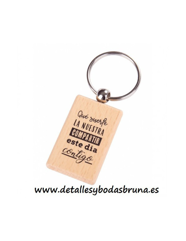 LLAVERO DE MADERA CON MENSAJE EN EL QUE SE PUEDE LEER " que suerte la nuestra compartir este DÍA contigo ". DETALLE PARA BODA, COMUNIÓN, CUMPLEAÑOS U OTRA CELEBRACIÓN ORIGINAL Y PRÁCTICO PARA TUS INVITADOS.