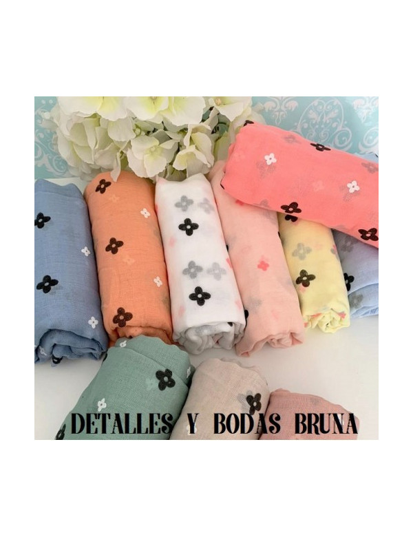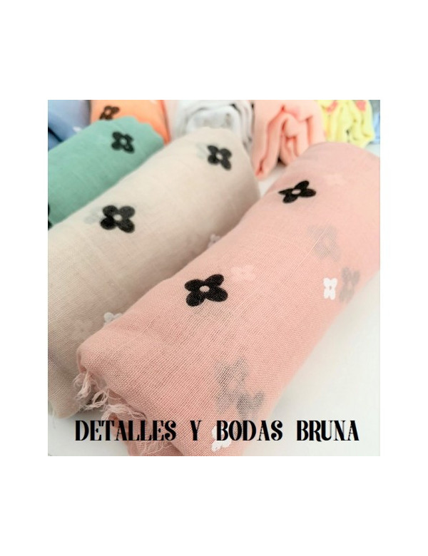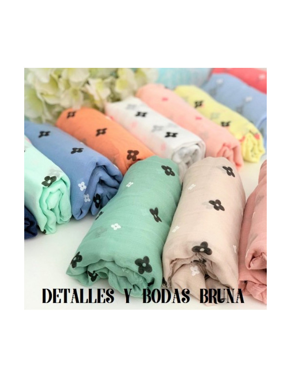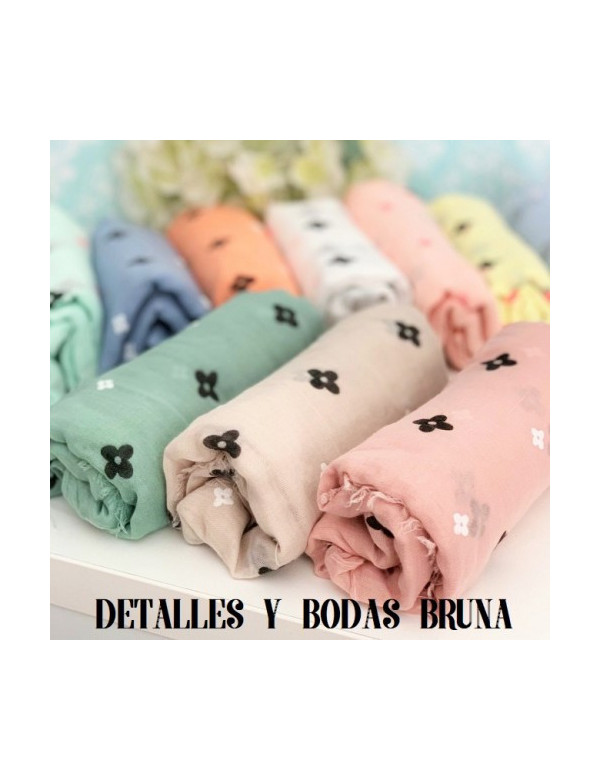 PASHMINAS MUY AMPLIAS DE EXCELENTE CALIDAD Y SUAVE TEXTURA DE COMPOSICIÓN VISCOSA, EN variedad de colores CON DELICADO MOTIVO DE PEQUEÑas flores blancas. DETALLE PERFECTO PARA REGALAR A LAS INVITADAS A TU BODA, COMUNIÓN, FIESTA, CUMPLEAÑOS, EVENTO O CELEBRACIÓN.