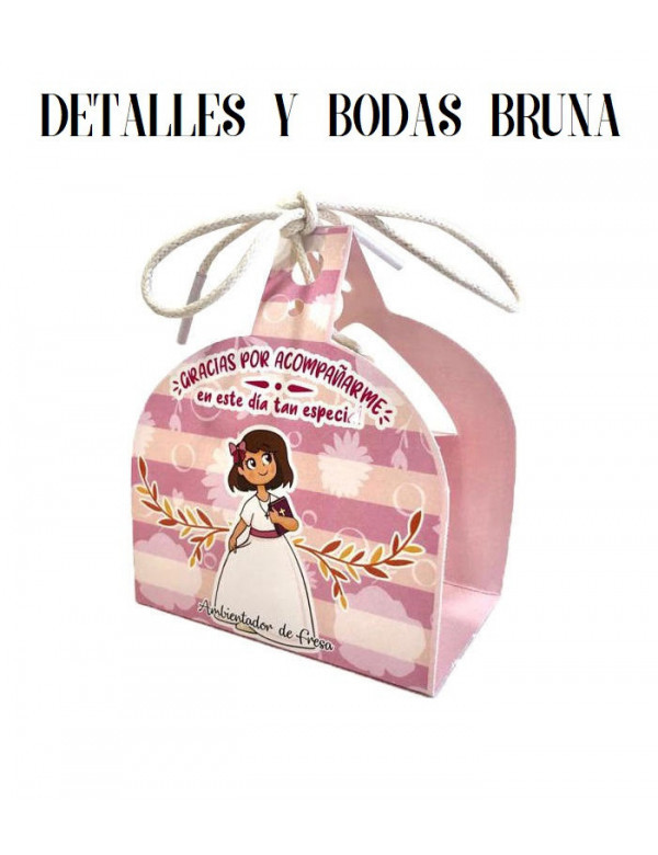 MIKADO CON AROMA A FRESA COMO DETALLE PARA LOS INVITADOS A LA PRIMERA COMUNIÓN DE TU NIÑA. REGALOS ÚTILES Y ORIGINALES QUE SEGURO USARAN LOS ASISTENTES A TU EVENTO. PRESENTADO EN CAJITA DECORATIVA CON MOTIVOS DE NIÑA CON FONDO ROSA Y BLANCO A RAYAS CON MENSAJE DE AGRADECIMIENTO.