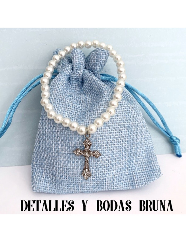 PULSERA ROSARIO ELÁSTICA CON BOLAS SIMULANDO PERLAS EN COLOR blanco CON CRUZ. DETALLE MUY BONITO PARA LAS NIÑAS Y MUJERES DE TU CELEBRACIÓN. DETALLE PERFECTO PARA CATEQUESIS Y CONFIRMACIONES.