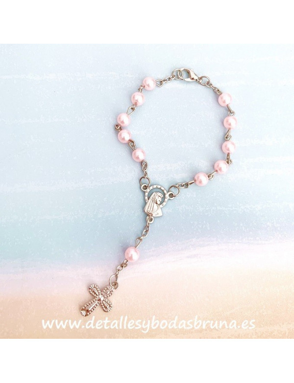 pulsera rosario con perlas rosa con cruz, virgencita y JESÚS. detalle muy bonito para las peques y mujeres de tu CELEBRACIÓN.