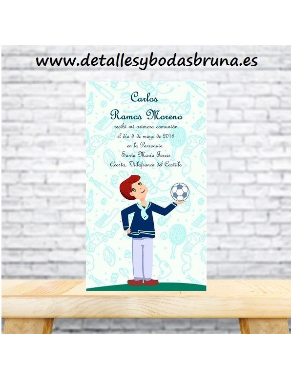 RECORDATORIO DE COMUNIÓN PARA NIÑO CON traje de marinero y pelota de FÚTBOL en la mano. TE RECOMENDAMOS QUE CONJUNTES LOS DE DETALLES DE LA COMUNIÓN DE TU HIJO CON NUESTRA COLECCIÓN MARINERA COMO PASHMINAS ANCLA, PASHMINAS CABALLITO DE MAR, ABREBOTELLAS ANCLA, INVITACIONES MARINERAS, ESTRELLAS DE MAR... y detalles relaciones con el futbol como relojes, carteles, pelotas, figuras de COMUNIÓN...