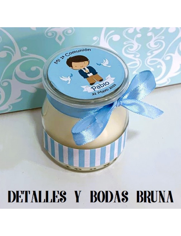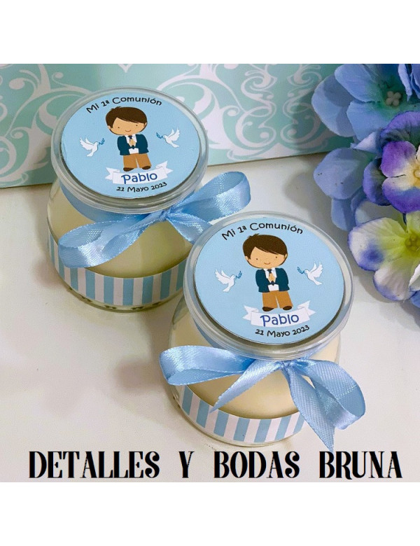 ORIGINALES VELAS AROMÁTICAS, DE GRAN CALIDAD Y AGRADABLES AROMAS, EN VASO DE CRISTAL PERSONALIZADAS CON NIÑO DE COMUNION. SE ENVÍAN CON LAZOS Y ETIQUETAS ADHESIVAS PREPARADAS.