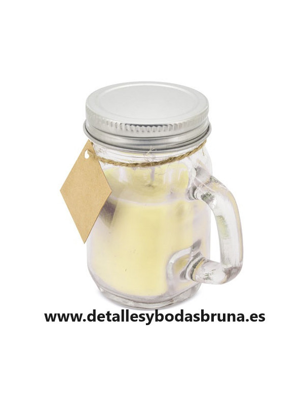 Vela en jarra con aroma a vainilla como detalle para Boda, Bautizo, Comunión y Aniversario. Te las podemos enviar personalizadas con nuestros lazos y nuestras etiquetas adhesivas.