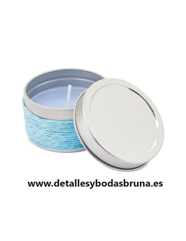 Vela aromática en latita celeste como detalle para mujer en tu Boda, Comunión o Bautizo. Regalo original que podemos enviarte personalizado con vuestro logo o con nuestras etiquetas adhesivas con nombres y fecha